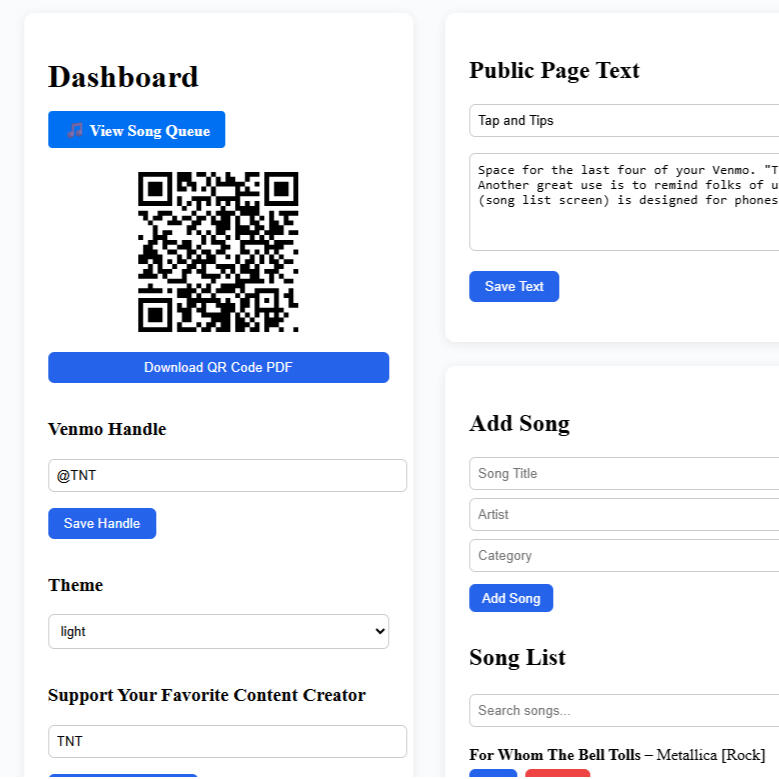 When fans scan your QR code, they’re taken to your public song list page.Here, they can:Browse songs by category, title, or artistView all your available song requestsQuickly find the perfect tune to Tap and Tip on🔍 Clean and mobile-friendly — no app needed.